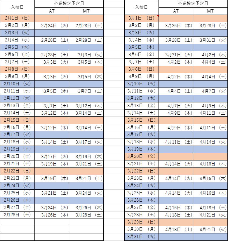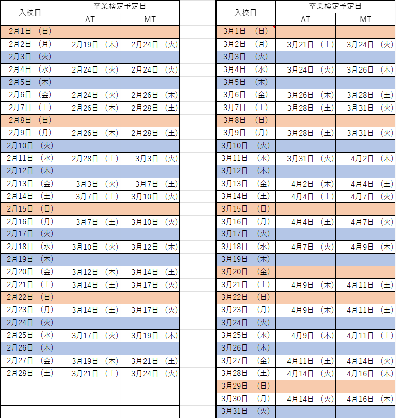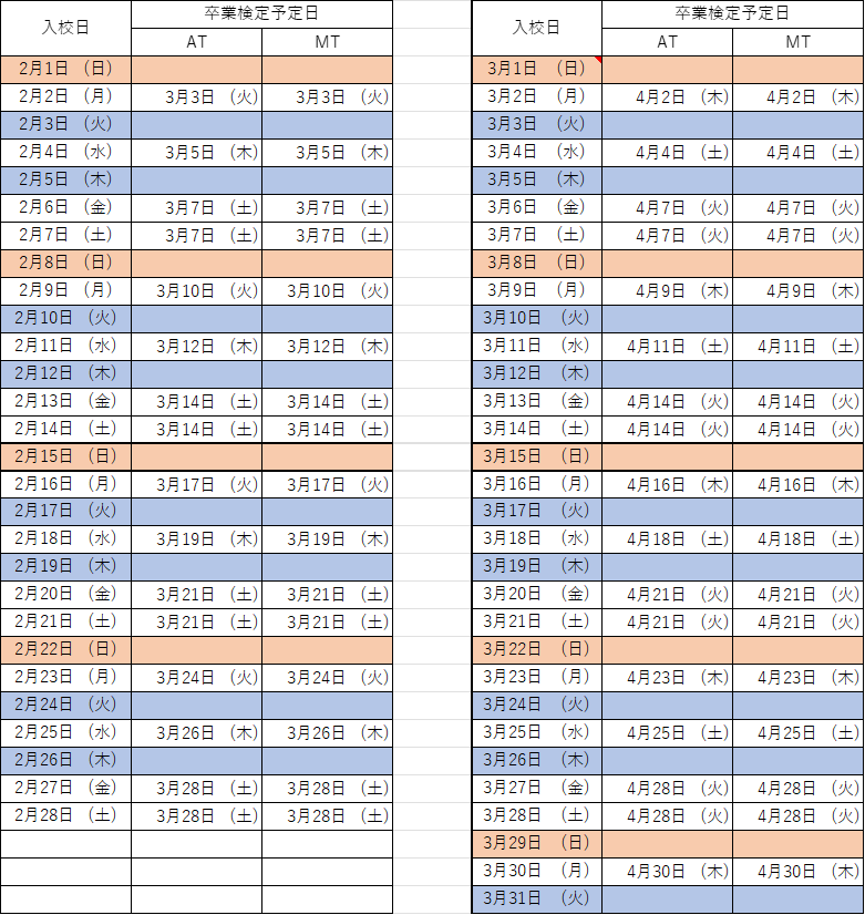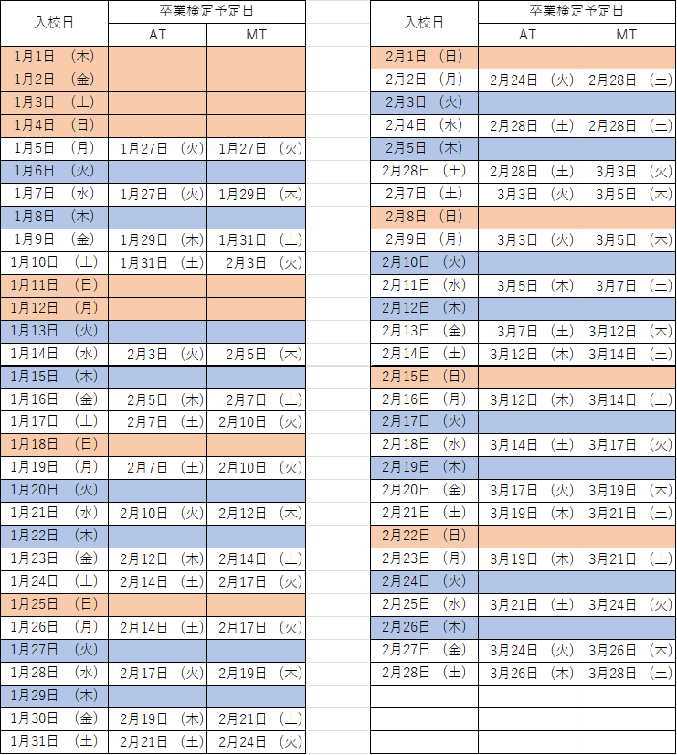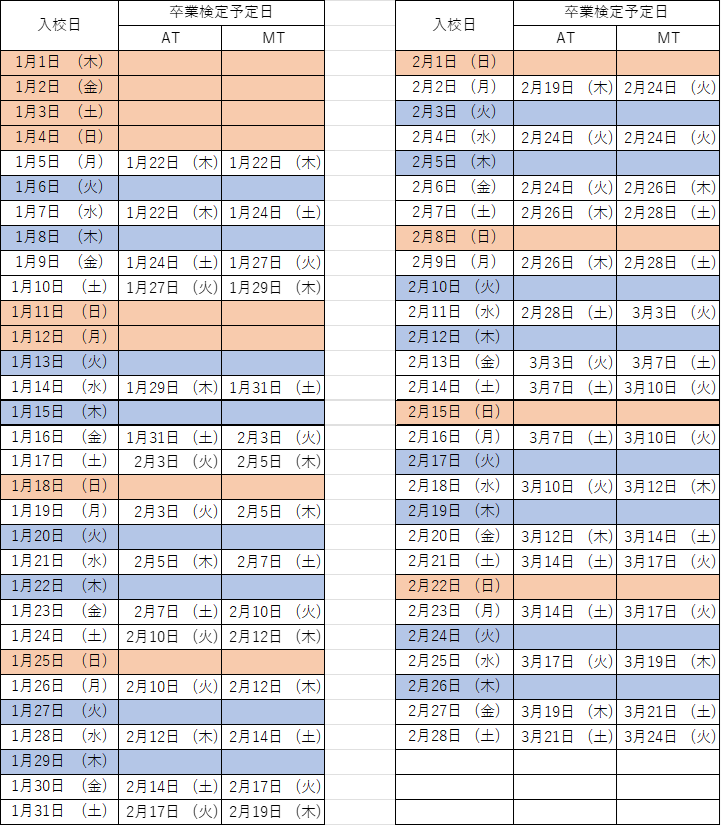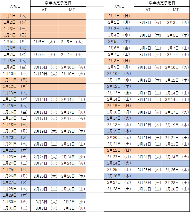 - 入校曜日により、卒業が可能な最短日数が異なります。